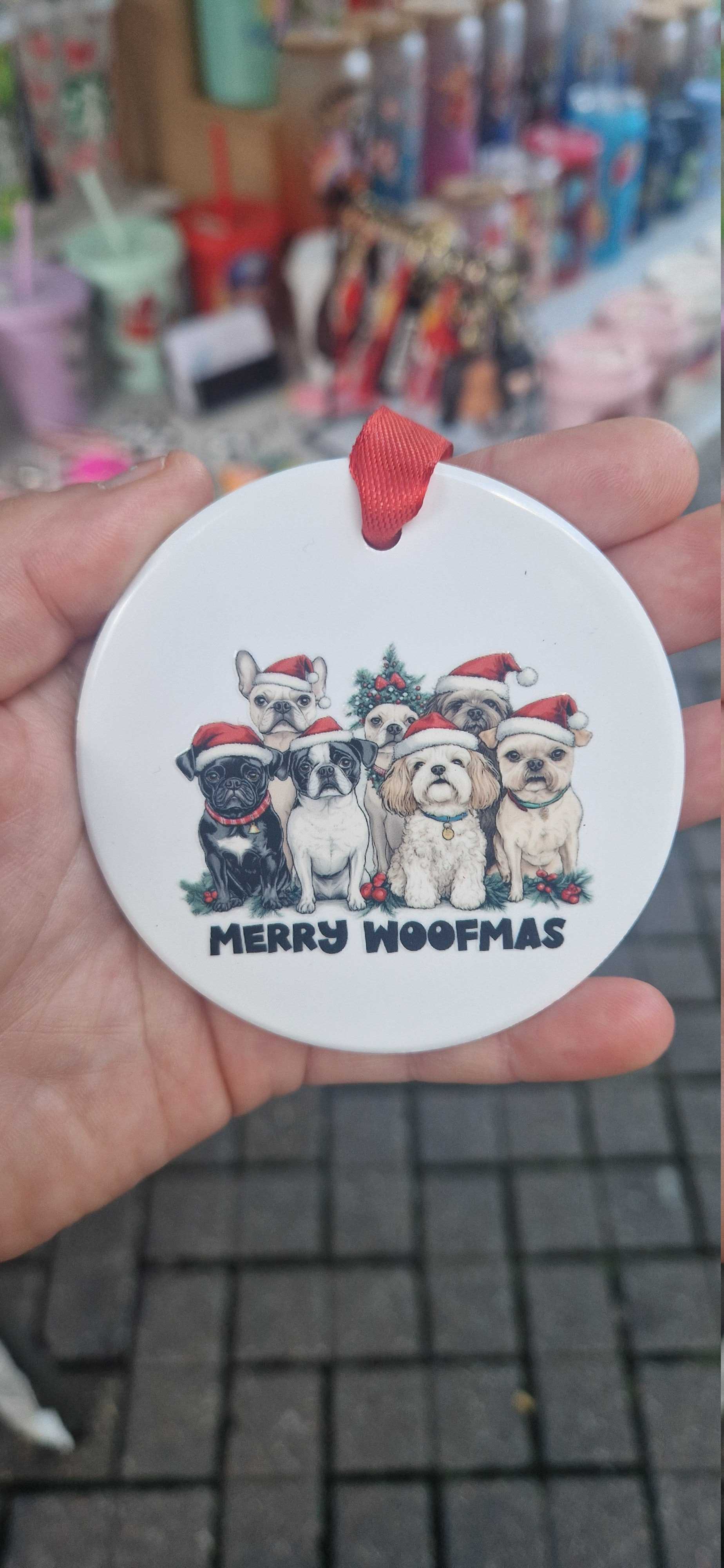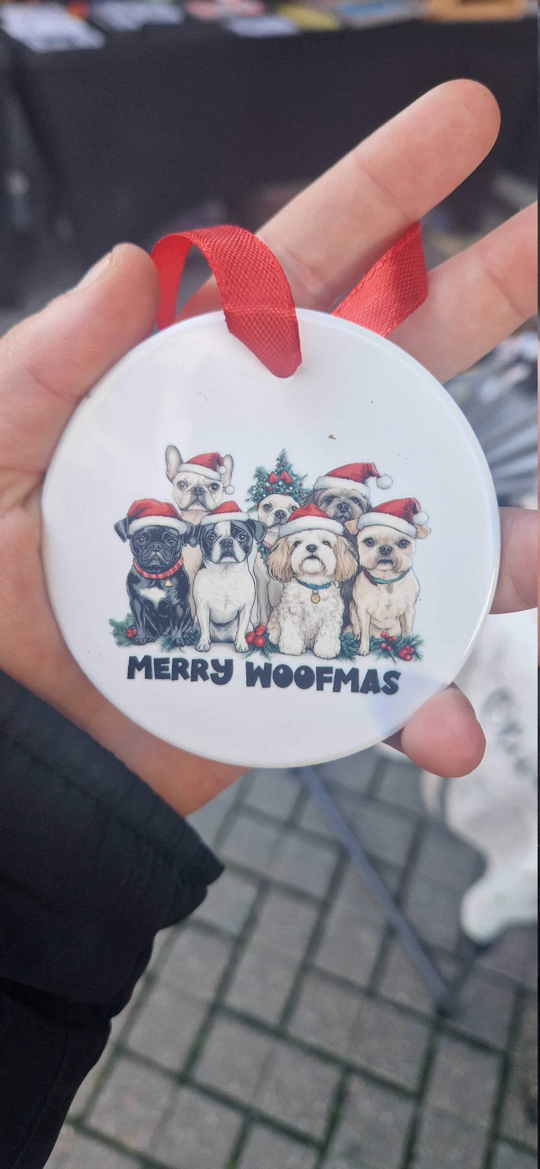 Merry woofmasCeramic flat baublesComes as seen with ribbon3 inches in size Can be hung on a christmas tree, or anywhere around the housePerfect for dog lovers ❤️