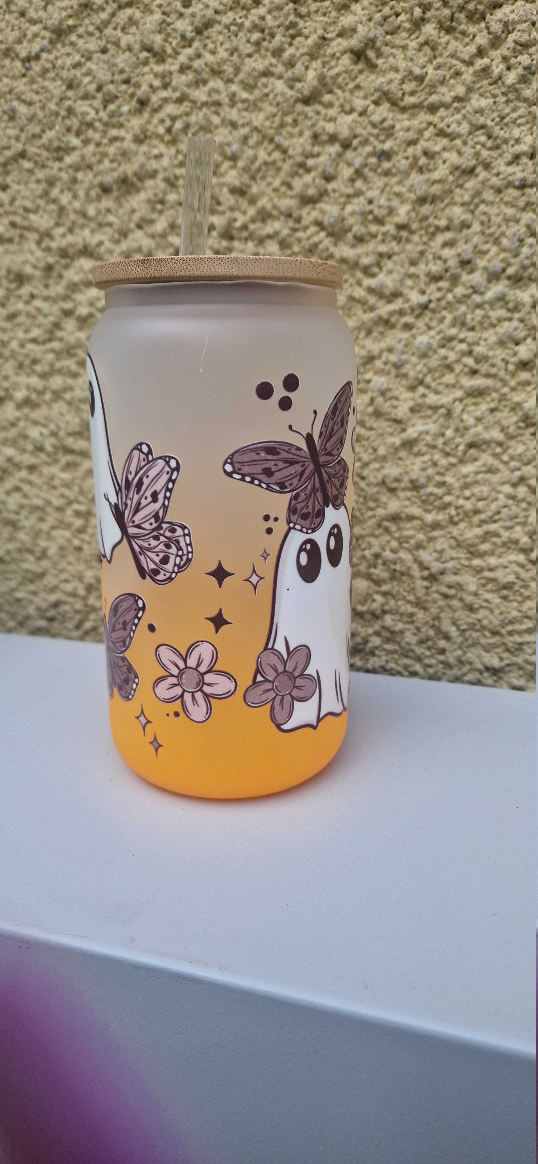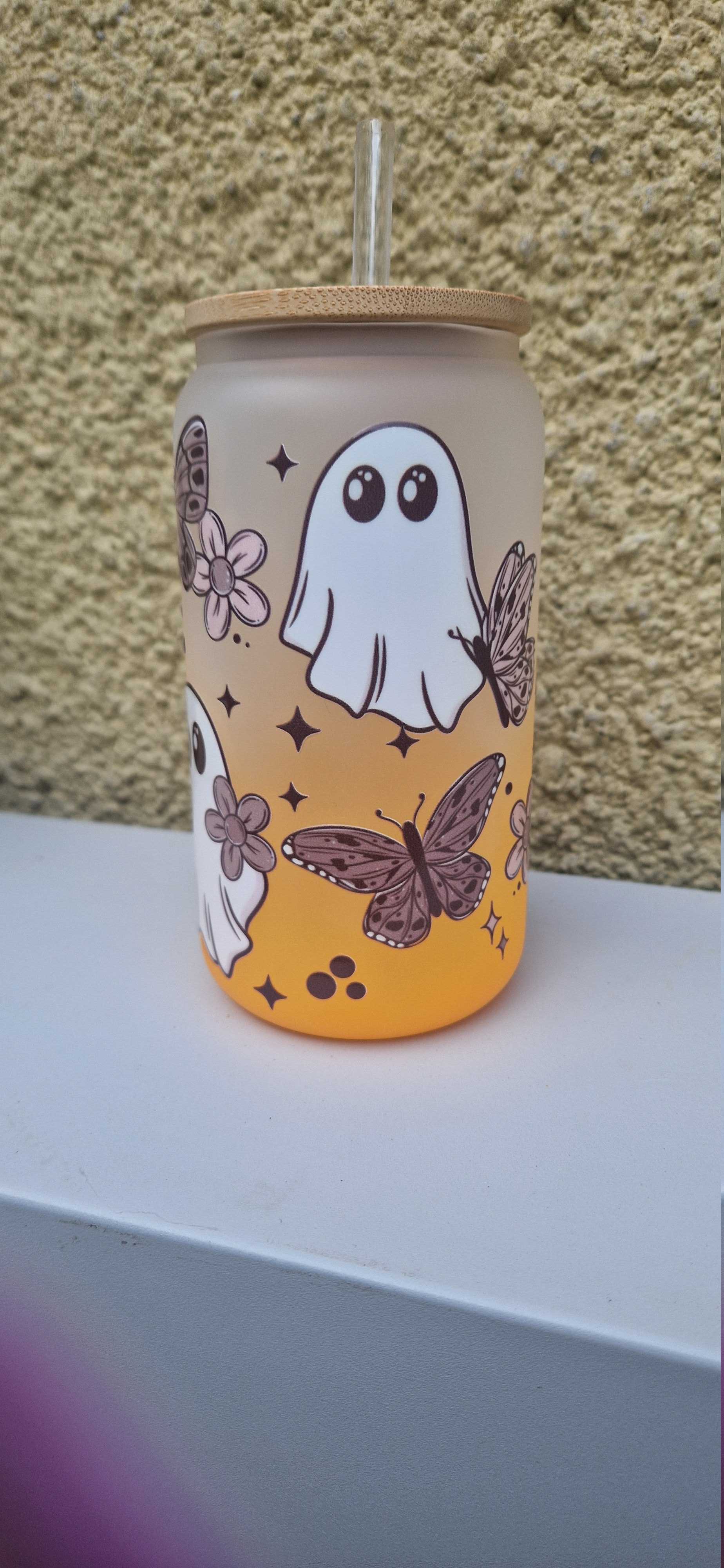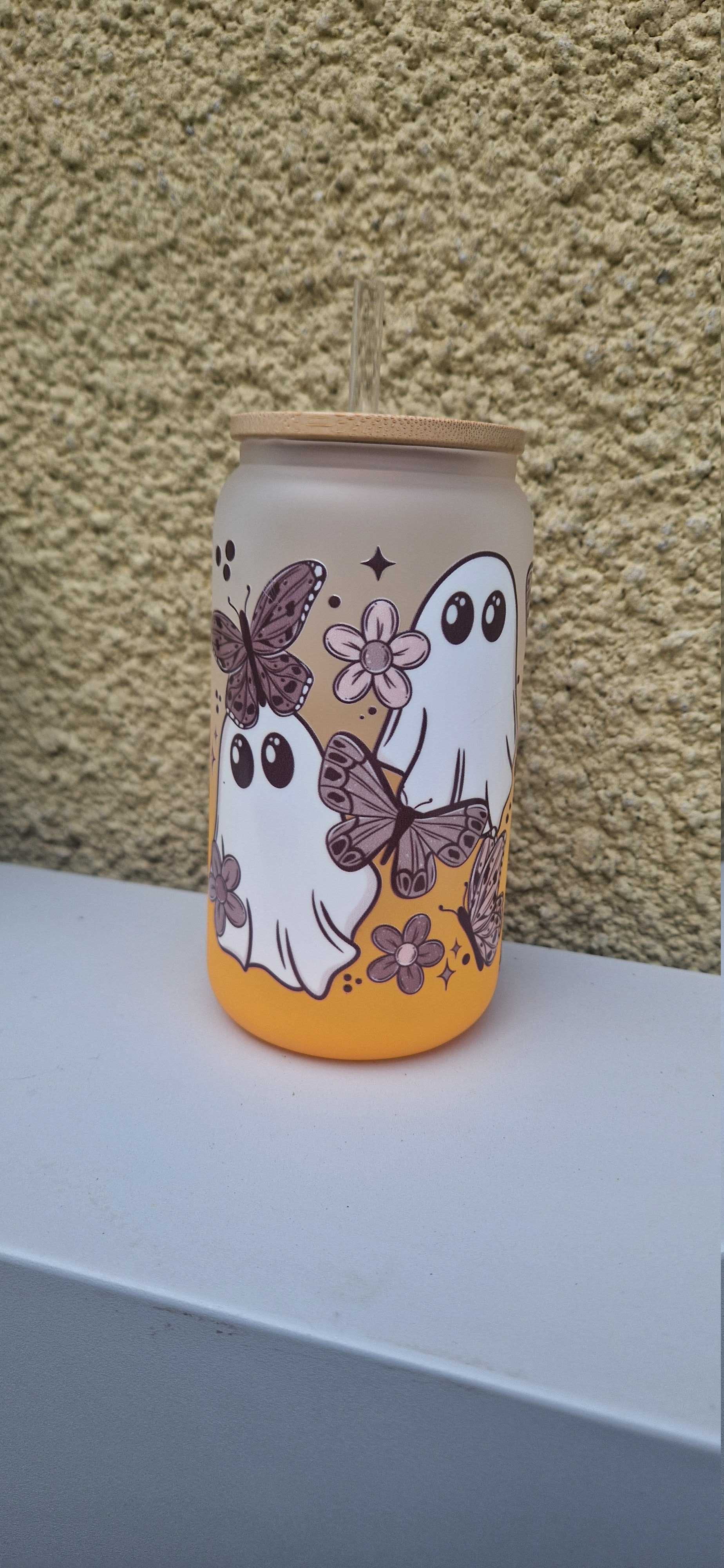 โจ Flower Ghosts design on orange 16oz bamboo glass. This distinctive combination of a flower ghost motif on an orange backdrop creates a bold statement piece. Perfect for those who appreciate unique aesthetics. The 16oz capacity makes it ideal for your favourite beverages. ๐น