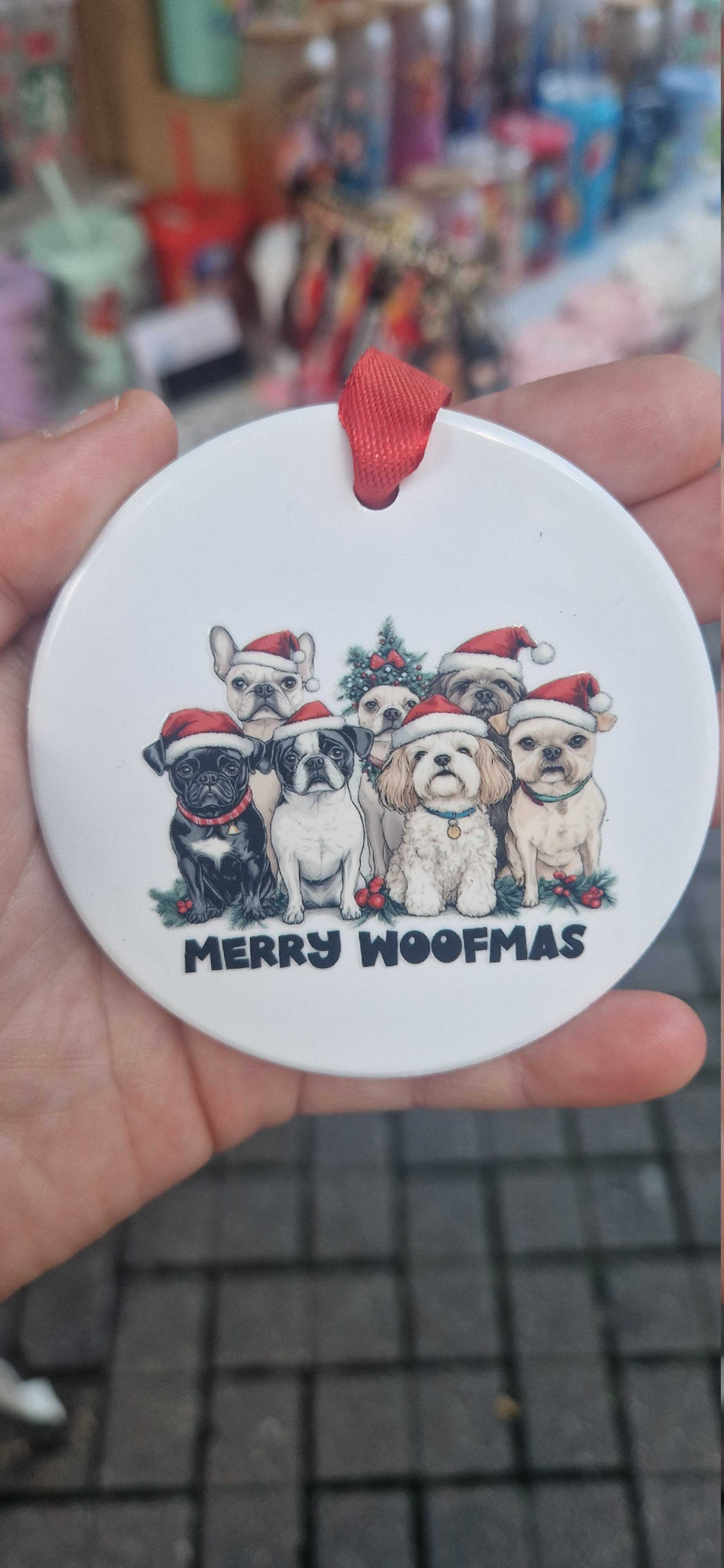 Merry woofmasCeramic flat baublesComes as seen with ribbon3 inches in size Can be hung on a christmas tree, or anywhere around the housePerfect for dog lovers ❤️
